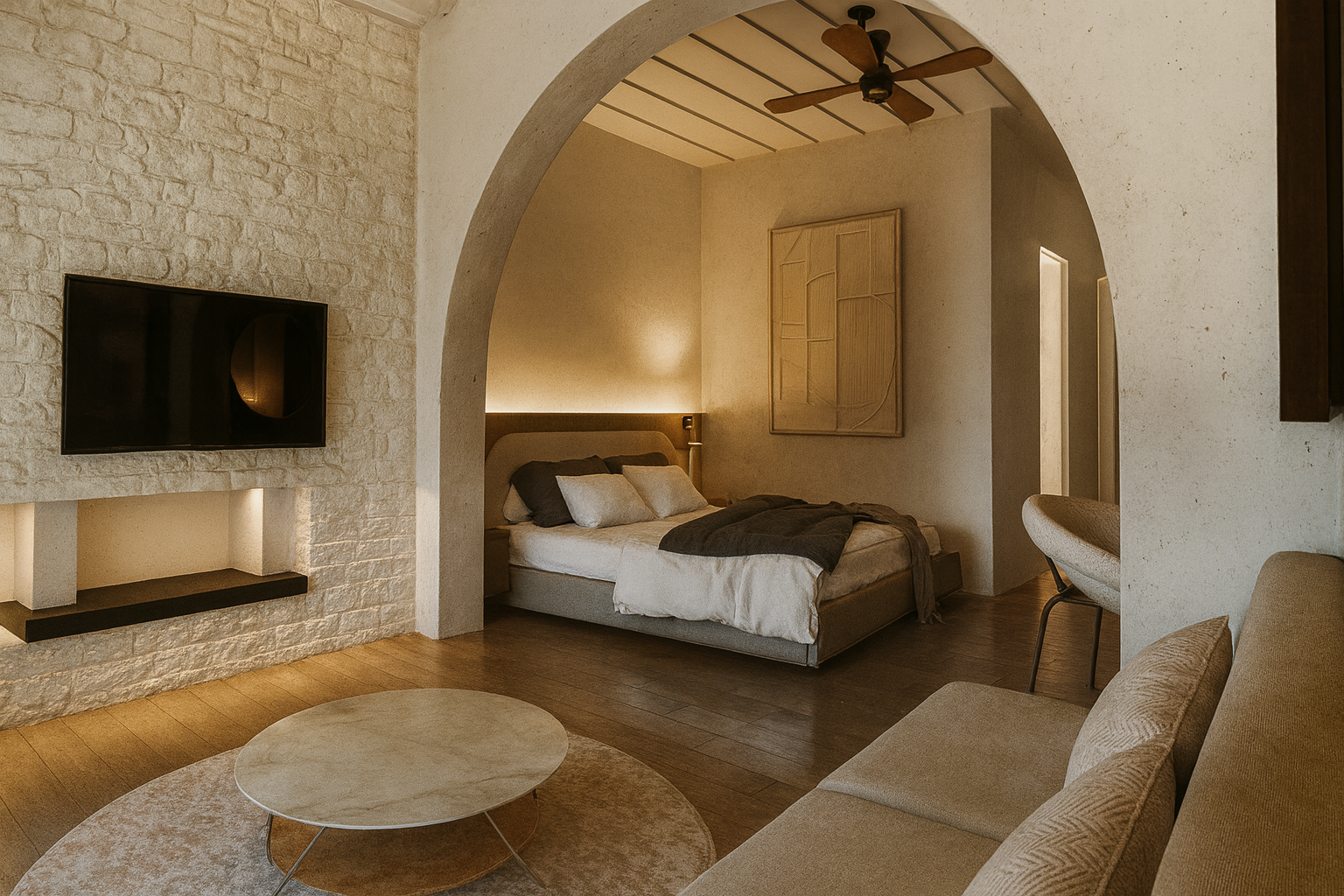 Πέτρινες εσωτερικές καμάρες , λευκοί τοίχοι και γηινα υλικά, δημιούργησαν το ξενοδοχείο Tholaria Boutique στην Αστυπάλαια,